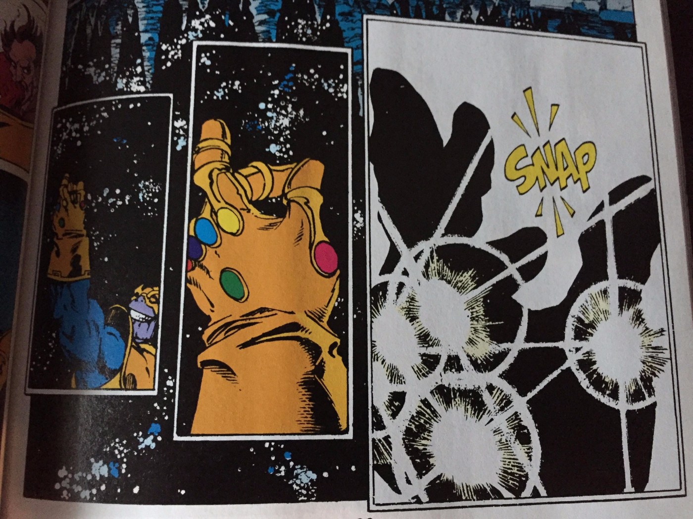 Featured top photo “Thanos snaps” from Marvel’s Infinity Gauntlet comic by John Bkila